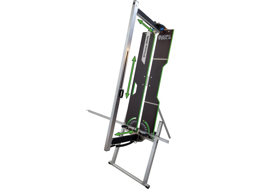 Bei der STYcutter M340 wird nicht – wie gewohnt – der Schneidbügel um die zu schneidende Dämmstärke ausgezogen. Der Schneidedraht verfährt stufenlos im schwenkbar an der Maschine verbauten Bügel und gewährleistet so ein platzsparendes Arbeiten auf dem Gerüst.